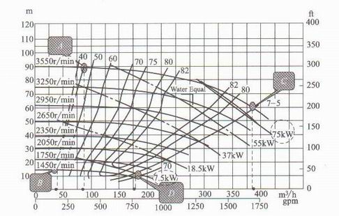 在變轉速下泵的*小流量限制是有眾多不同速度下的泵的性能曲線上左側的*小流量限制點所形成的一條*小流量限制線(由A、B 兩點連成的線),如圖2-43所示。在變轉速下泵的*大流量限制是由眾多不同轉速下的泵性能曲線上*右端的限制點所形成的一條限制線(如由C 、D兩點連成的線)。