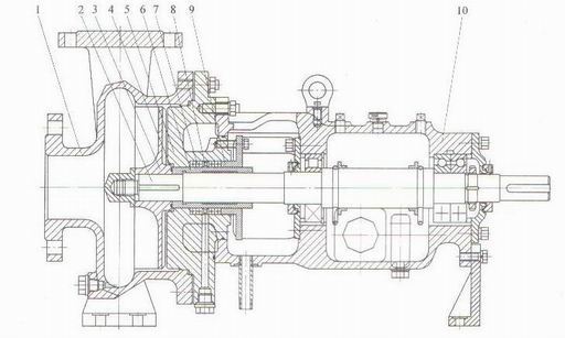 1—泵體 2—軸 3—葉輪 4—靜密封 5—泵蓋 6—軸套 7—填料 8—水封環 9—密封壓蓋 10—托架