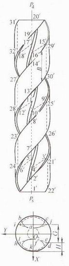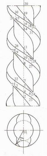 類密封性是指共軛的螺桿螺旋型面的嚙合線在螺桿螺旋橫截面上的投影嚙合線連續,在理論上嚙合線能將相鄰的螺旋槽有效地隔開。這是排出腔和吸入腔完全隔開的必要條件。類密封性也就是在本章第二節中提到的對螺桿螺旋齒形曲線的要求。不銹鋼三螺桿泵理論螺旋型面的嚙合線形狀如圖3-3所示。采用擺線齒形曲線就是為了得到圓弧形的嚙合線。這在本章第二節已論證過,在理論上是安全符合類密封性的要求。從圖3-13繪制的螺桿螺旋嚙合的密封線可以看出:互相嚙合的螺桿螺旋接觸線能將螺旋槽隔成互不相同的兩部分。從動螺桿的螺旋棱邊6-7和8-9;和主動螺桿螺旋型面上的6-7和8-9相接觸,從動螺桿螺旋型面齒頂圓表面的接觸線7-8和主動螺桿螺旋型面齒根圓表面7-8相接觸,這樣就使主動螺桿的螺旋槽以接觸線5-6-7-8-9和從動螺桿上的6-7-8-9-10分隔成互不相通的兩部分空間。這些接觸線即為螺桿螺旋嚙合的密封線,它們在螺桿螺旋面上都是連續的,而且每隔半個導程(即一個螺距)重復出現。因此,在理論上螺桿螺旋互相嚙合時,這些密封線能將螺旋槽分割成互不相通,即互相密封的兩部分。擺線齒型嚙合的密封線在橫截面上的投影為圓弧形,故完全符合類密封性的要求。