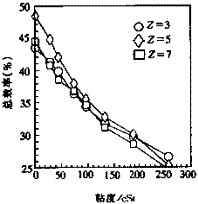 2.3 水力效率 圖6表示不同葉片數(shù)條件下水力效率隨粘度的變化關(guān)系。當粘度低于200cSt時,Z=5葉輪水力效率比其它葉輪高;當粘度高于200cSt時,Z=3葉輪比其它葉輪高。這種變化趨勢與泵總效率隨粘度的變化情況很一致,見圖9。