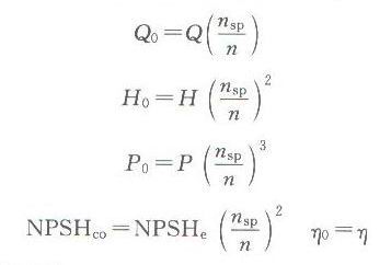 在于規(guī)定轉(zhuǎn)速不符的轉(zhuǎn)速下得到所有數(shù)據(jù)均應(yīng)換算為以規(guī)定轉(zhuǎn)速為基準(zhǔn)的數(shù)據(jù)。流量Q 、揚(yáng)程H、軸功率P、
