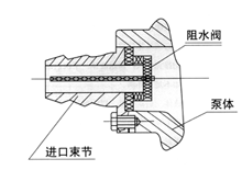 1.擰下軸承體與泵體連接的四個螺絲,舊時將機械密封和泵蓋松開。 2.擰開葉輪螺坶(右旋)取下葉輪、鍵和泵蓋,再將機械密封從泵溢蓋中取下。 3.用拉子拉下聯軸器然后拆下鍵,軸承端溢,最后將軸和軸承拆開。 4.泵的裝裝配順序按上述相反進行。 5.自吸泵的進口束節重裝時,請注意阻水閥應向正面,以便與阻水閥正面貼合保證白吸效果(見右下圖)。