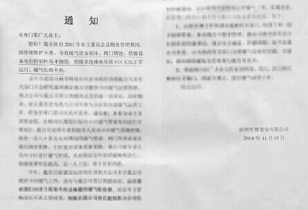 15日,記者來到位于黃河二路渤海十六路的門第小區(qū),小區(qū)內(nèi)的一座高層居民樓里的電梯已經(jīng)斷電停止運(yùn)行,有水正順著電梯從樓道里流出。樓前圍著幾個(gè)居民,正在看剛貼在樓道口的通知。通知上稱,小區(qū)由于業(yè)主委員會(huì)及物業(yè)管理維護(hù)不善,暖氣設(shè)備損壞,閥門銹蝕、供暖設(shè)備電位控制柜基本燒毀,供暖系統(tǒng)癱瘓,小區(qū)暖氣長期不熱。